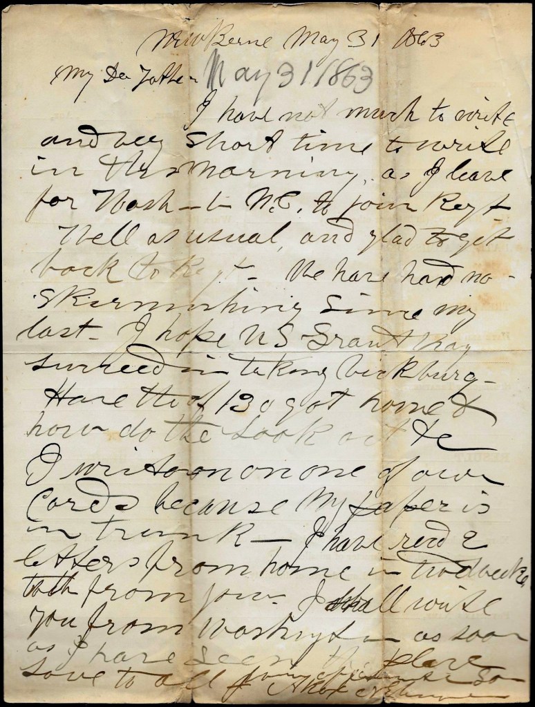 In the second letter from New Bern, North Carolina, Augustus tells his father he is ready to leave for Washington D. C. to rejoin the regiment.