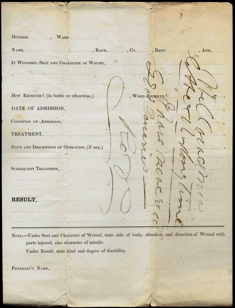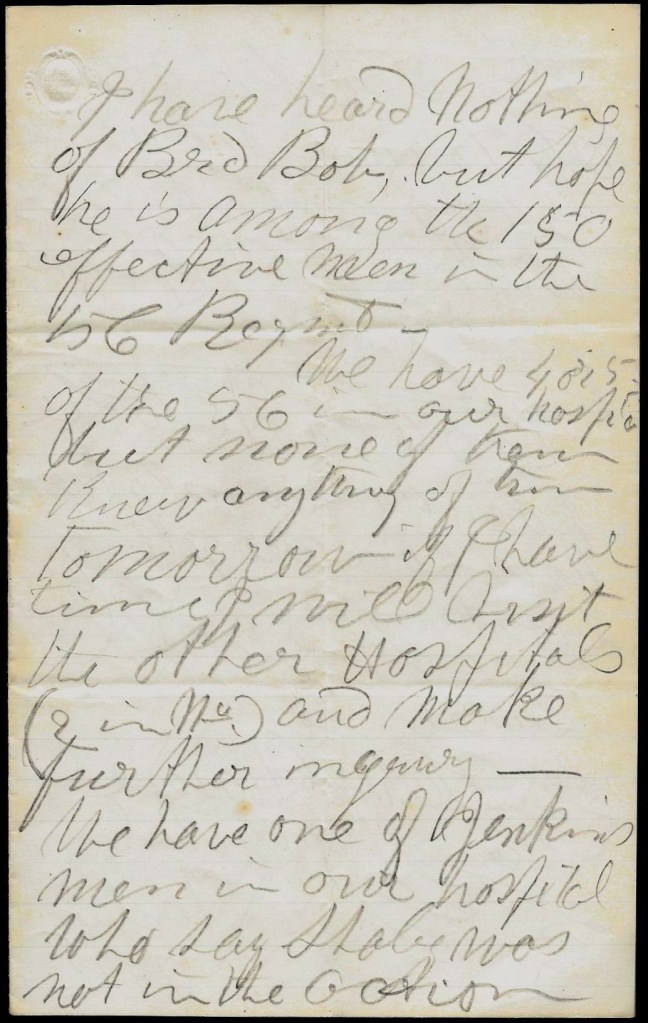 …I have heard nothing of Bro. Bob but hope he is among the 150 effective men in the 56th [Pennsylvania] Regiment. We have 4 or 5 of the 56th in our hospital but none of them knew anything of him. Tomorrow if I have time, I will visit the other hospitals (2 in Va.) and make further inquiry. We have one of Jenkin’s men in our hospital who say Stobe was not in the action.