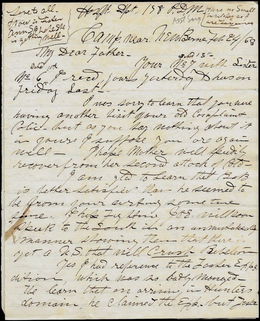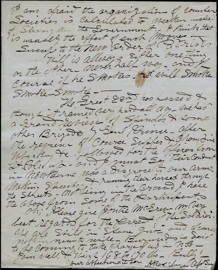 The Great [February] 22nd [Washington’s Birthday] has passed & thought it rained very hard all day, we had a Grand Review of Spinolas & some other Brigade by General Prince. After the review, of course supper & champaign, whiskey, &c. followed for the officers from Lt. Cols. up—and I must say their conduct in New Bern was a disgrace to our arms. Making speeches & running their horses through the streets. Not being in the crowd, I have the above [account] from some of the participants.