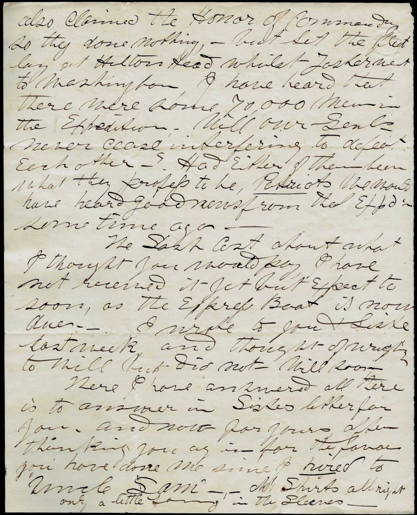 Yes, I had reference to the Foster Expedition which was so badly managed. We learn that on arriving in Hunter’s domain, he claimed the expedition but Foster also claimed the honor of commanding so they done nothing but let the fleet lay at Hilton Head while Foster went to Washington. I have heard that there were some 70,000 men in the expedition. Will our generals never cease interfering to defeat each other? Had either of them been what they profess to be—Patriots—we would have heard good news from that expedition some time ago.