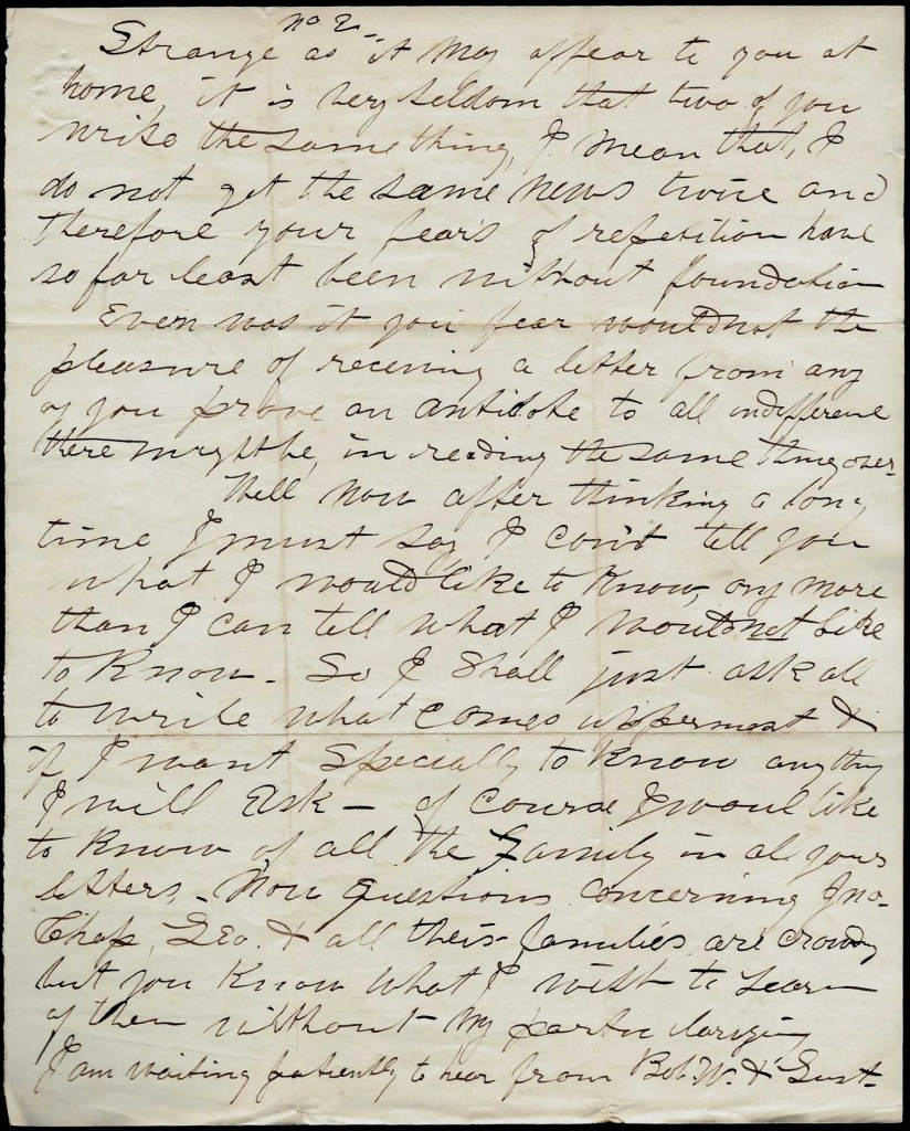 Well now, after thinking a long time, I must say I can’t tell you what I would like to know, any more than I can tell what I would not like to know. So I shall just ask asll to write what comes uppermost & if I want specially to know anything, I will ask. Of course I would like to know of all the family in all your letters. Now questions concerning John Chap, Geo. & all their families are crowding but you know what I wish to learn of them without my particularizing.