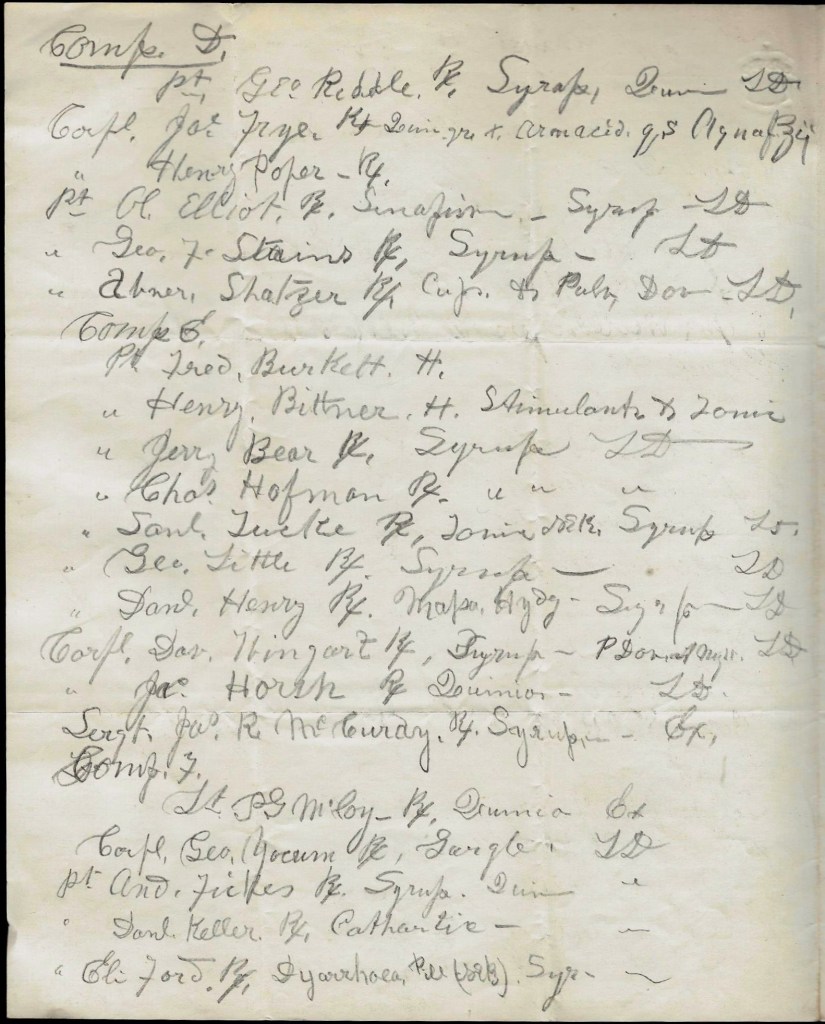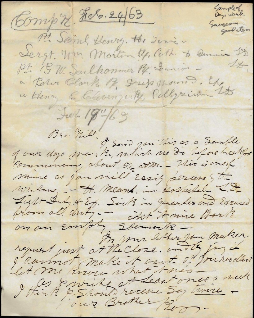 In the first letter, Augustus writes his Father of the failed “Foster Expedition” and then provides his brother William with the day’s list and treatment of sick soldiers in the 158th Pennsylvania. From the list, we learn that Asst. Surgeon had to treat sixty-six soldiers that morning before he even had the opportunity to eat his breakfast.