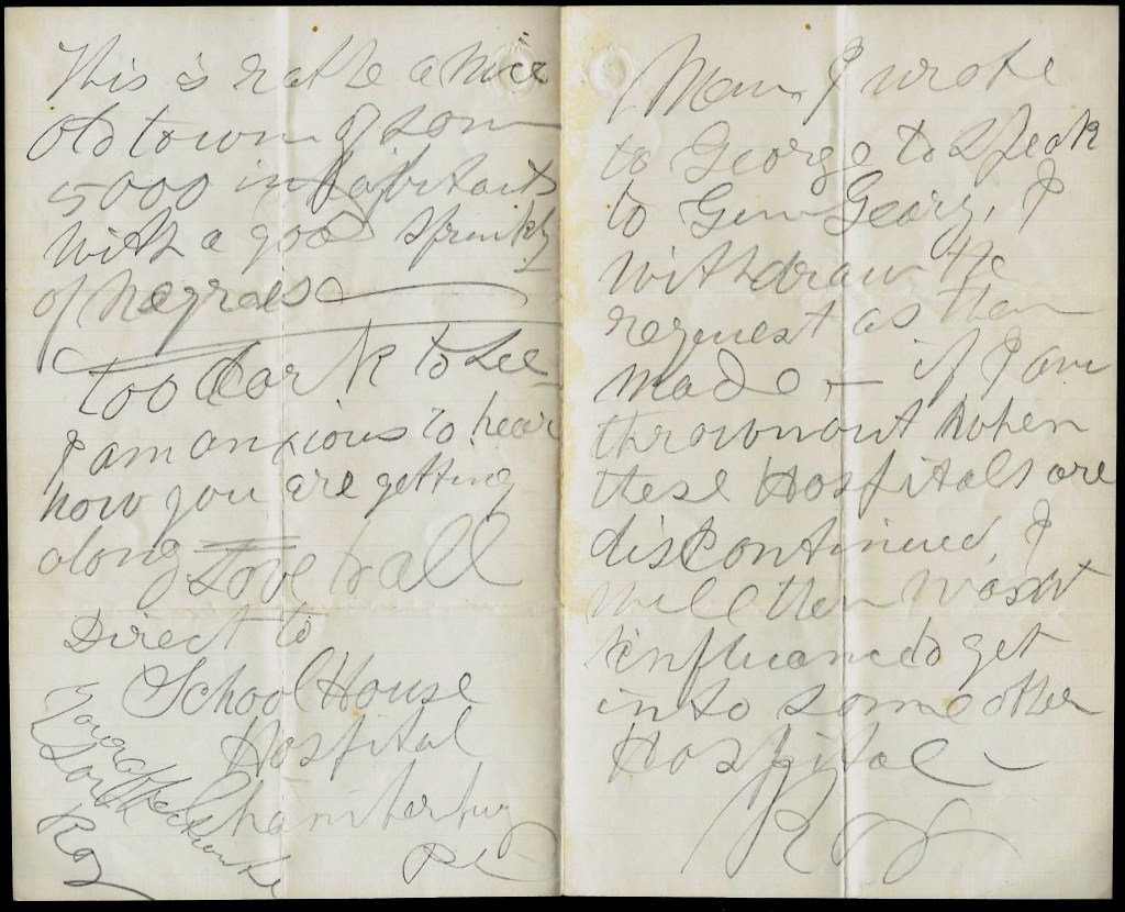 This is rather a nice old town of some 5,000 inhabitants with a good sprinkling of negroes. Too dark to see. I am anxious to hear how you are getting along. Love to all. Direct to School House Hospital, Chambersburg, Pa.